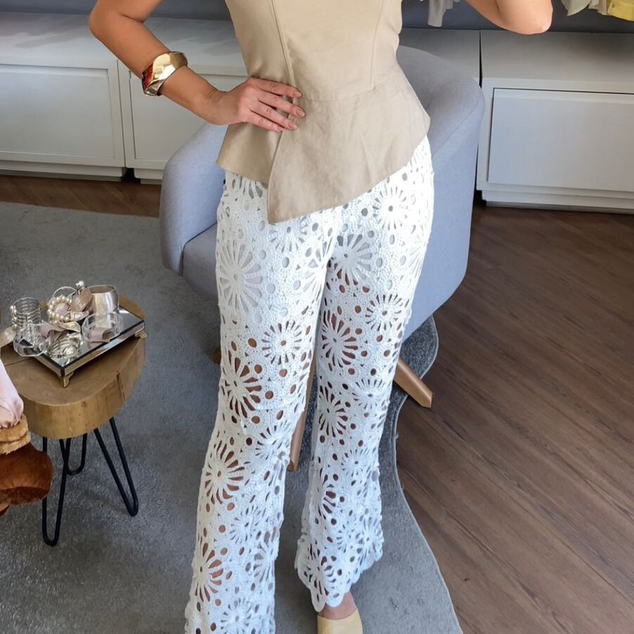 Peça fabricada em trabalho artesanal, com recortes vazados em desenho floral que trazem textura e modernidade ao look. Modelagem reta com cós confortável e caimento fluido, perfeita para produções casuais chiques e dias iluminados.