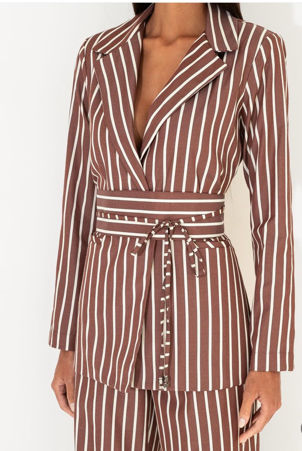 Este conjunto em alfaiataria traz um visual sofisticado e moderno, com listras verticais que alongam a silhueta e valorizam o corpo.